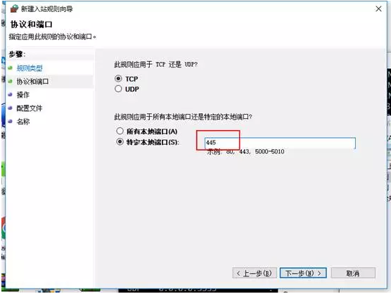 6、特定本地端口,输入445,下一步