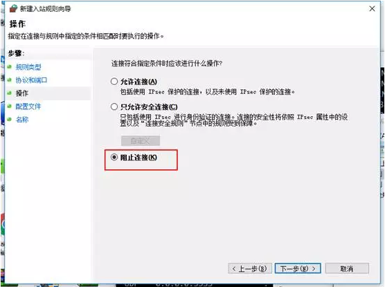 7、选择阻止连接,下一步