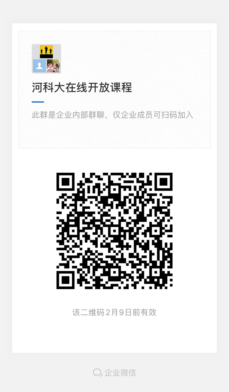 (5)由于微信群人数有限制,为了使网投官网老师都能及时接收到在线开放课程的相关信息,在“我i科大”企业微信中新建了“河科大在线开放课程” 企业微信群,(“我i科大”企业微信登录及使用方法参见通知:关于推荐使用“我i科大”企业微信客户端作为学校即时通讯工具的通知/info/1049/29131.htm),没进微信群的老师可以加入“河科大在线开放课程” 企业微信群,两个群会同步发布各类信息。已加入“我i科大”企业微信的老师可通过企业微信扫描以下二维码加入“河科大在线开放课程” 企业微信群: