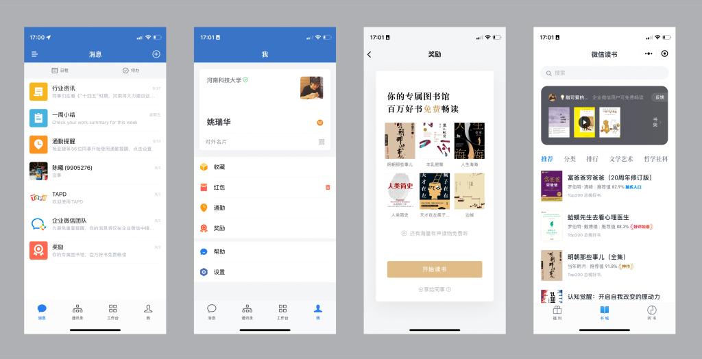 阅读使用方式:打开企业微信客户端,点击 “我”——“奖励”——“开始读书”。