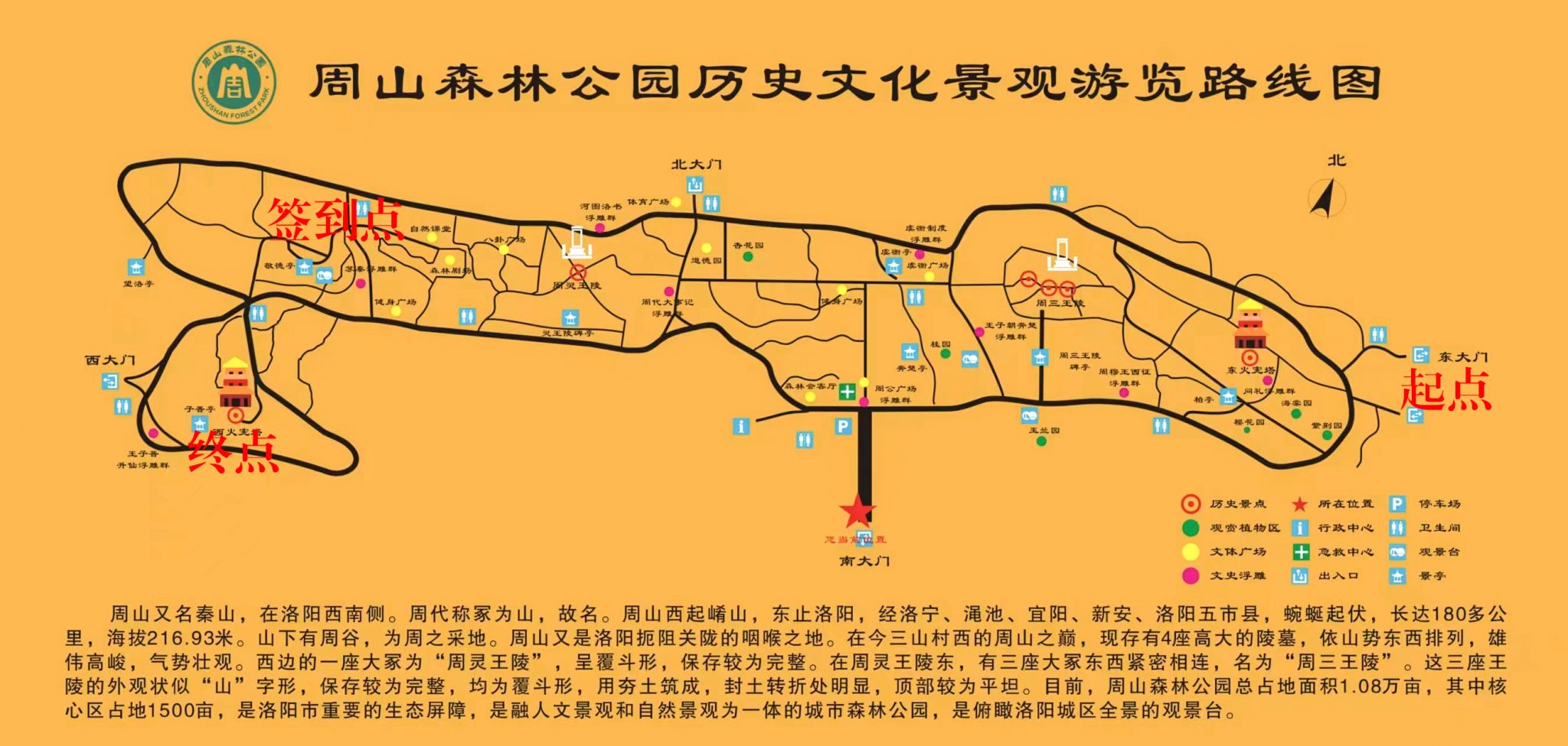 东起周山森林公园东入口(与往年相同,31路公交“周山大道乐山路口南站”向南100米路西)——向西至“敬德亭”(签到点)——终点“子晋亭”。