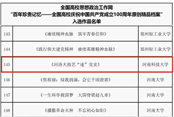 校新闻中心讯 近日,“高校庆祝中国共产党成立100周年原创精品推广行动”评审结果公布,网投官网原创作品《河洛大鼓艺“述”党史》入选《百年珍贵记忆——全国高校庆祝中国共产党成立100周年原创精品档案》。