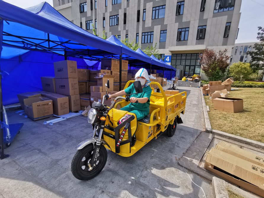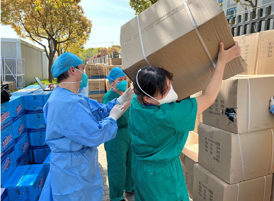 王鲜茹除了带领大家学习感控知识和实战操作外,还肩负着为河南援沪医疗队的物资发放,从接收防护用品、清点数量,到统计各家医院所需,严谨的工作作风,有条不紊地精准发放。当队员们看到她娇小的身躯,一刻不停地忙前忙后,特别心疼!争着留下来帮助,最后大家商量让乔传勋、展可可协助分发物资。面对成百上千件物资,他们三人合理安排,一人报数、一人取物、一人与对方核对数量及型号,一直忙碌到晚上十点多任务完成后,才想起还没吃中饭和晚饭,15个多小时滴水未进,眼里只有堆积如山的防护物资,心里想的就是快速发放,让大家安心、放心,心无旁骛投身抗“疫”工作。