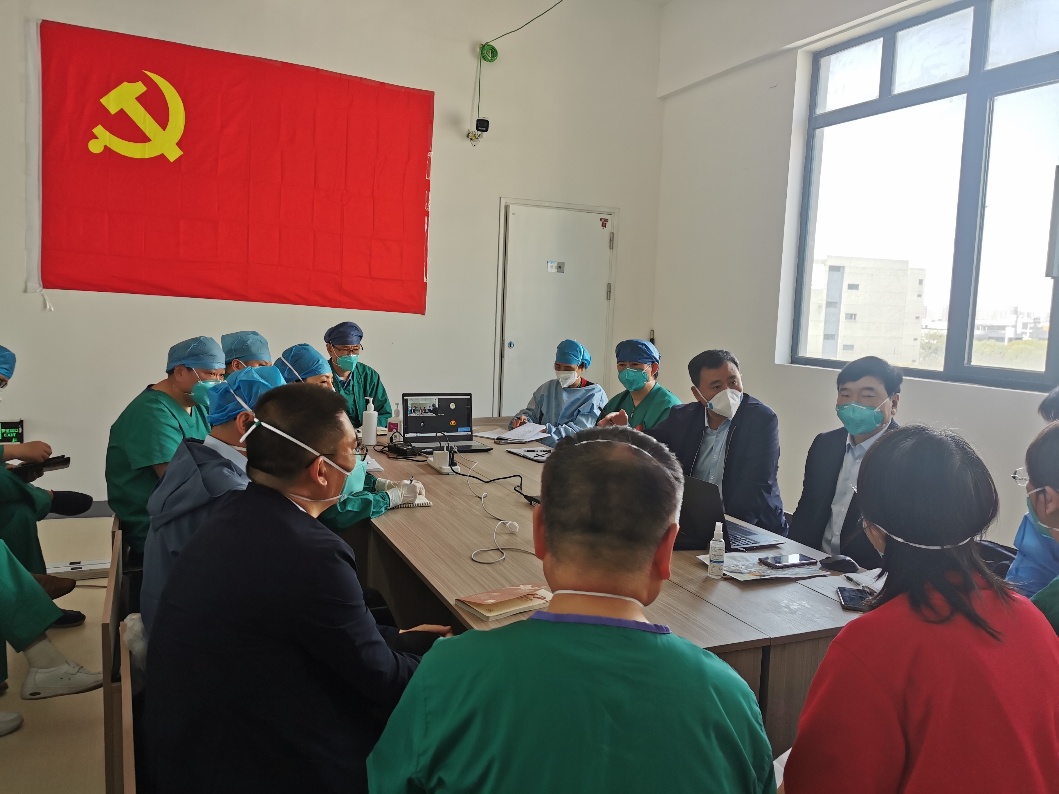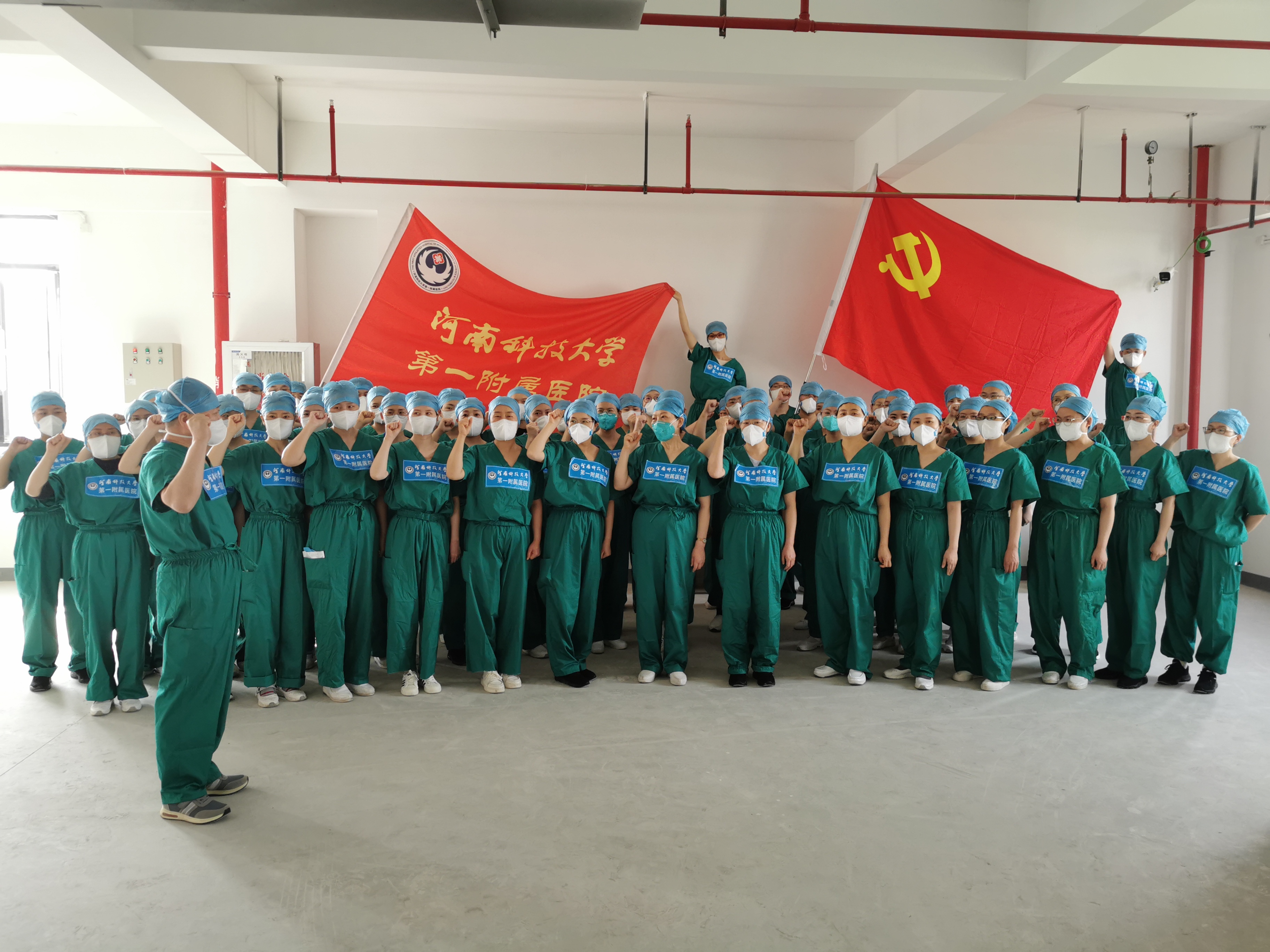 4月3日,河科大一附院同省内其他6个援沪医疗队一起抵达上海。高社干院长担任队长,全队共有队员186名,包含30名医生,150名护士,3名控感医生,2名后勤工作人员。4月3日晚21点,河科大一附院援沪医疗队即召开援沪医疗队第一次工作会议,成立河科大一附院援沪医疗队临时党总支及下属5个党支部,以充分发挥基层党组织战斗堡垒作用和广大党员干部的先锋模范作用。4月4日,临时党总支组织全体医疗队员召开了全体工作会议。河科大一附院郝晓伟副院长任党总支书记,他对工作进行了强调:要统一思想,加强党员的思想政治教育和学习,要求党支部书记切实负起责任,传递正能量,带领党员同志们“亮身份、见行动、树榜样、勇担责”,积极发挥党员的模范带头作用。