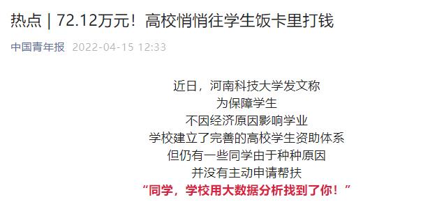 最终,“算”出了3606名需要帮助的同学,无需申请,学校将向他们的校园一卡通中充值共计72.12万元,让学生在享受补贴的同时,柔软的内心也能得到保护。