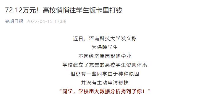 校新闻中心讯 4月15日,《人民日报》《光明日报》《中国青年报》等媒体平台纷纷报道网投官网悄悄为3606名学生充值72.12万元温暖餐补这一暖心举措,取得了积极的社会反响。全文如下: