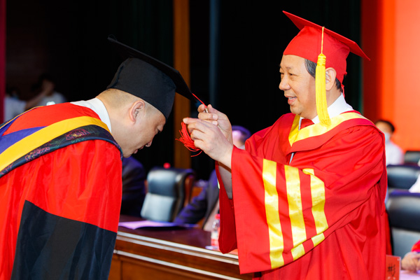 校党委书记王洪彬,校长孔留安,副校长李友军、李全安、魏世忠、张小安分别为博士学位获得者,硕士、学士学位获得者代表正冠拨苏,授予学位,并合影留念。