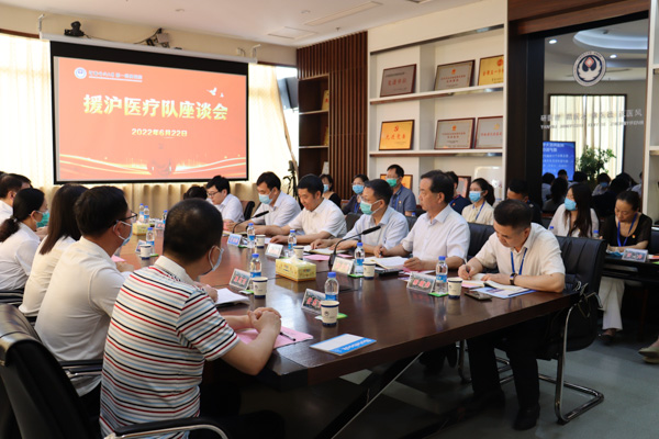 校新闻中心讯 白衣执甲援沪情,千里驰援载誉还。为了弘扬伟大抗疫精神,凝聚前进的强大动力,6月22日下午,学校在一附院肿瘤医院第一会议室召开援沪医疗队座谈会。校党委书记王洪彬、副校长张小安参加座谈会。座谈会由一附院党委书记董平栓主持。