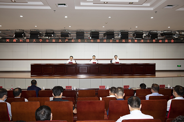 校新闻中心讯 6月24日上午,学校在图书馆522报告厅召开全面从严治党工作推进会暨巡视整改工作动员会,深入学习贯彻习近平总书记关于全面从严治党和巡视工作重要论述,安排部署巡视整改、巡察、基层党委(党总支)履行全面从严治党主体责任等工作。校领导王洪彬、孔留安、李友军、李全安、朱春阳、孟伟、张小安、杨霞,医学部党委书记、主任雷方出席会议。全体中层干部参加会议。会议由校长孔留安主持。