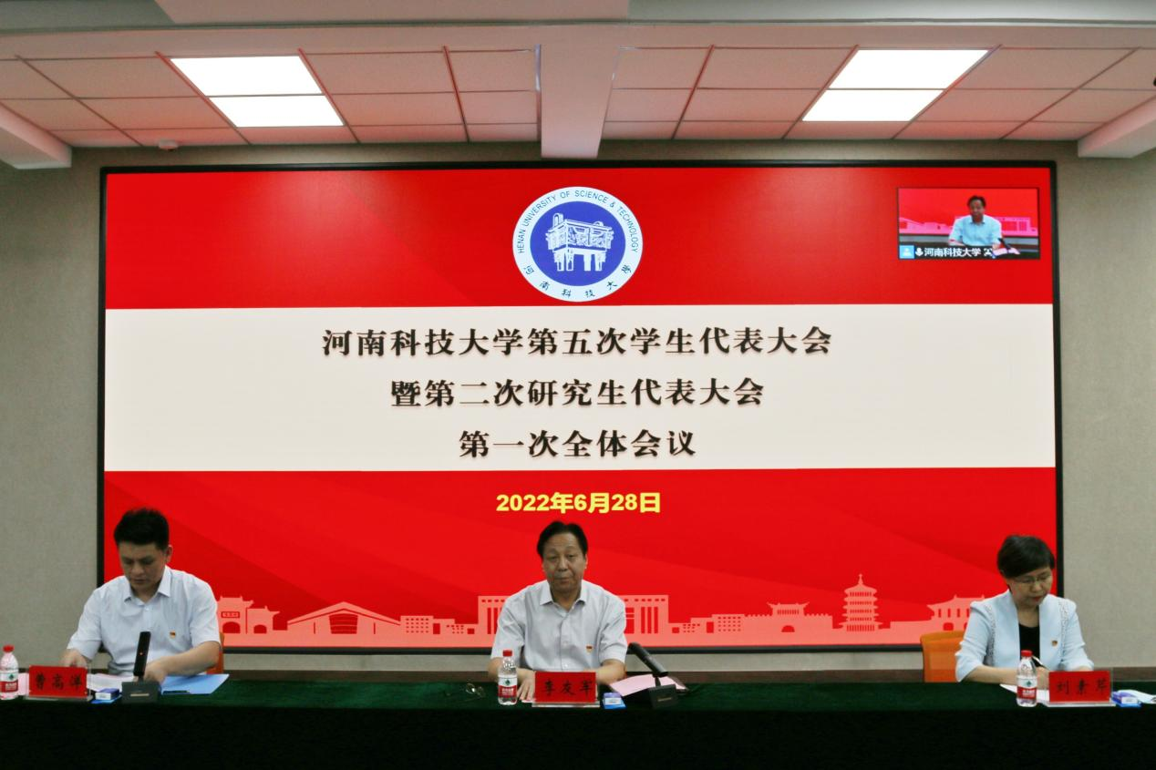 校团委书记曹高洋向第五次学生代表大会暨第二次研究生代表大会致贺词。学生会执行主席高增辉、研究生会执行主席孙文远分别代表学生会、研究生会作了工作报告。