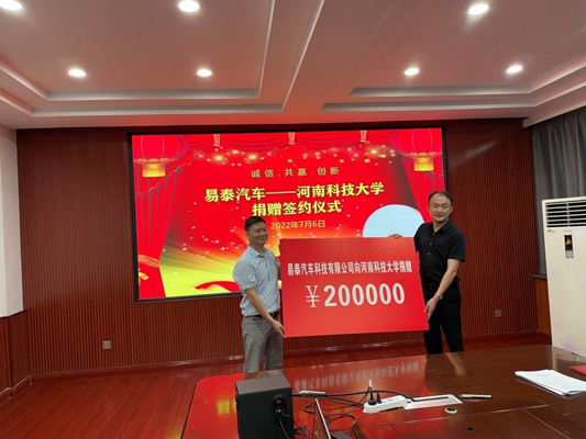 据悉,易泰汽车科技有限公司捐赠的20万元将用于学校的“河洛风”赛车队建设,帮助车队完善赛车,提升赛车性能,进一步提高赛车队队员自主创新和实践操作能力,促进学校人才培养质量。