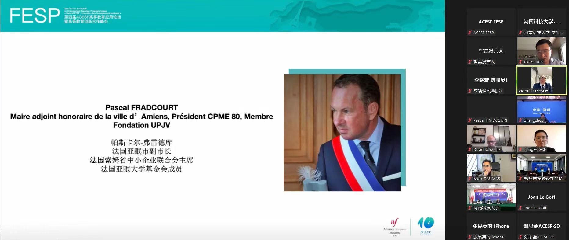 校新闻中心讯 11月24日下午,十大网投正规信誉官网建校70周年校庆国际论坛暨第四届ACESF高等教育应用论坛通过云视频方式隆重举行。法国亚眠市副市长帕斯卡尔·弗雷德库先生(Pascal FRADCOURT),法国驻华大使馆合作与文化行动司高等教育、研究与创新参赞杜马科先生(Marc DAUMAS),校党委书记王洪彬教授等出席会议。来自法国萨克雷大学、巴黎东大学、波尔多大学、山东第一医科大学、郑州航空工业管理学院等30余所中法高校师生代表近千人线上参加论坛。论坛由法国中法教育交流协会主席任树磊先生和网投官网国际合作与交流部部长毛鹏军教授共同主持。