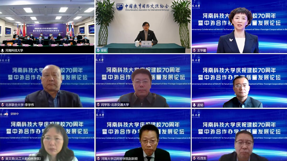 校新闻中心讯 12月4日,为庆祝建校70周年,学校通过线上线下相结合的方式举办“庆祝建校70周年暨中外合作办学高质量发展论坛”。中国教育国际交流协会副秘书长安延,省教育厅对外合作与交流处处长王华星,北京联合大学原校长、中俄交通大学联盟中方主席李学伟,北京交通大学副校长闫学东等领导专家,校党委书记王洪彬、校长孔留安,校党委副书记孟伟,副校长李全安、张小安、侯小改、庞新厂等校领导出席论坛。相关职能部门和专业学院主要负责人、教学负责人、中方合作教师以及国际教育学院、莫动理工学院教职工等100余人参加论坛。论坛由李全安和国际合作与交流部部长毛鹏军分别主持。