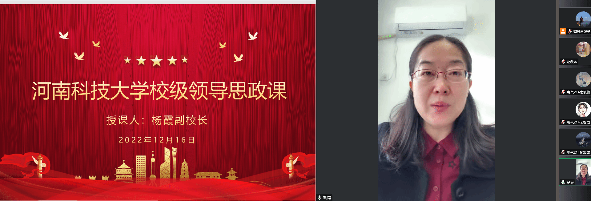 校新闻中心讯 12月16日,副校长杨霞以“在疫情中成长 向最美青春致敬”为题目,为联系班级信息工程学院电气工程及其自动化214班全体同学讲授一堂生动的线上专题思政课。思政课由信息工程学院党委书记赵荣坡主持。