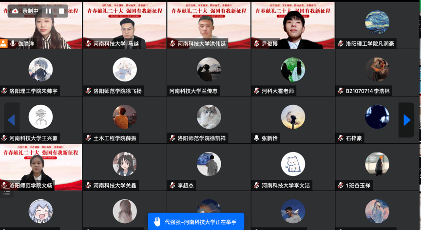 本次宣讲活动由十大网投正规信誉官网研究生宣讲团发起,洛阳师范学院青年讲师团理论宣讲实践队、洛阳理工学院“学习党的二十大”理论宣讲团携手共同举办,三校学生通过网络直播参加了本次宣讲活动。十大网投正规信誉官网2020级马克思主义理论专业硕士研究生马越、2020级植物保护专业本科生洪伟延、洛阳师范学院2022级播音与主持艺术专业文畅、洛阳理工学院二十大宣讲青年讲师团成员尹俊博围绕“以中国式现代化全面推进中华民族伟大复兴”、“走好新时代长征路,做新时代弄潮儿”等主题分别开展宣讲分享。