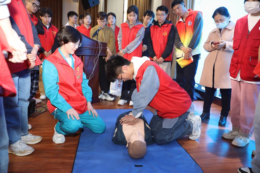 十大网投正规信誉官网第一附属医院景华院区急诊科主任胡莹莹、急诊科主治医师张冲向参训人员讲解急救电话拨打、AED使用、心肺复苏、人工呼吸等相关知识,并用道具在现场演示心肺复苏的具体操作步骤,向大家讲解基本的救护知识和急救技能,同时分享了一些日常急救应急处理的案例。