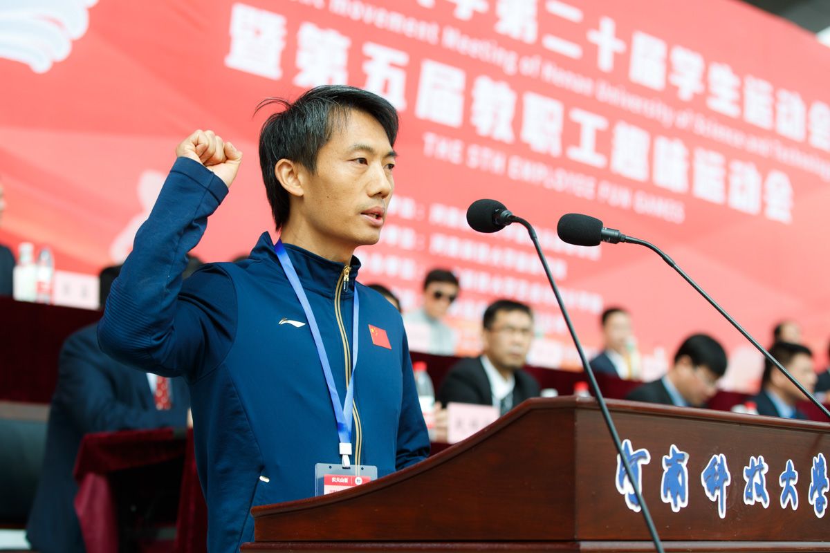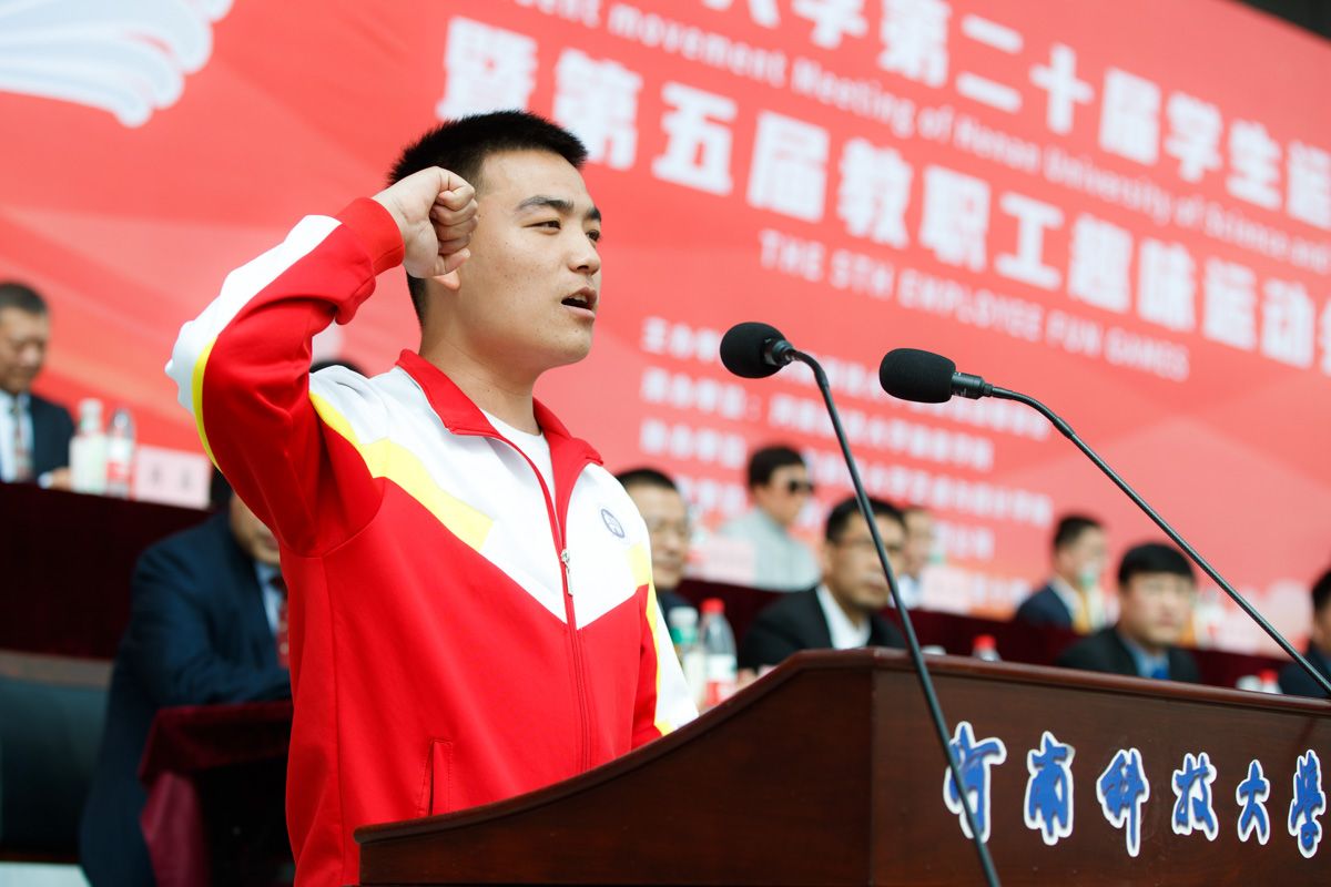 机电工程学院杨芳、艺术学院付少意分别代表教师和学生运动员宣誓,表示将弘扬奥林匹克精神,听从指挥,遵守纪律,遵守规则,尊重裁判,尊重对手,团结协作,勇于拼搏,赛出风格、赛出水平、赛出友谊;体育学院教师常志良代表裁判员宣誓,表示将本着公平、公正、严肃、认真的原则,严格遵守竞赛规程和规则,服从裁判长,尊重运动员,确保大会各项比赛顺利进行。
