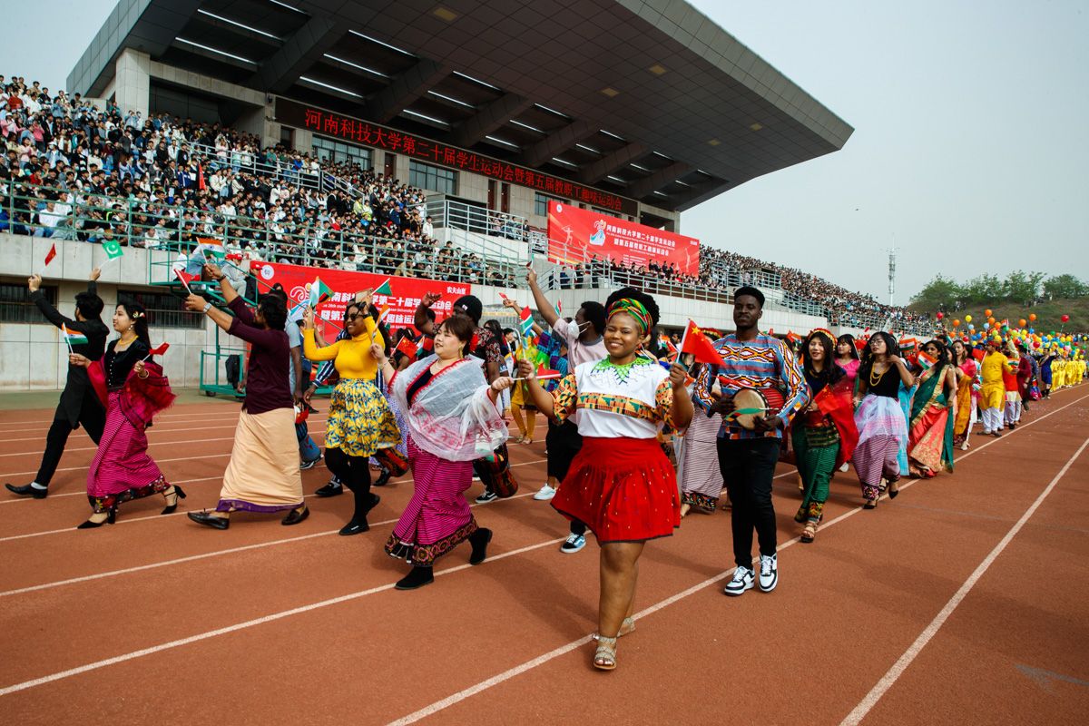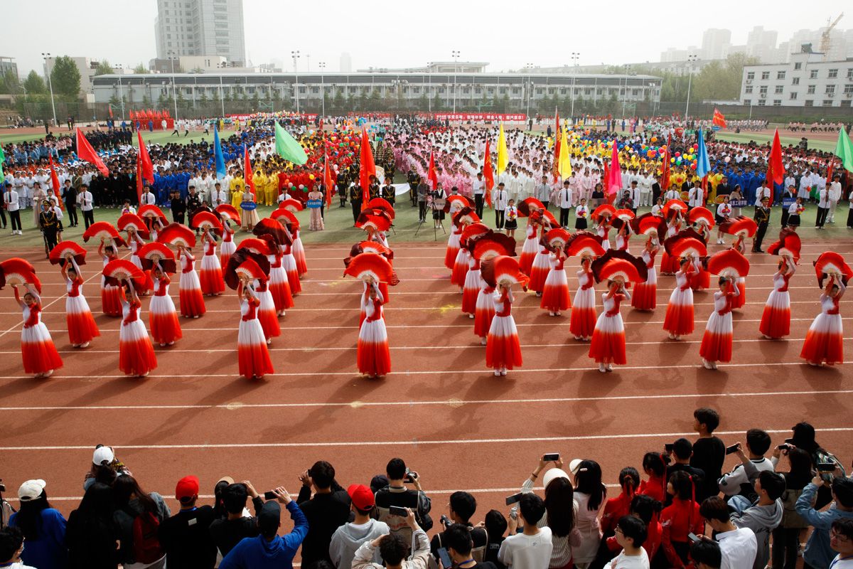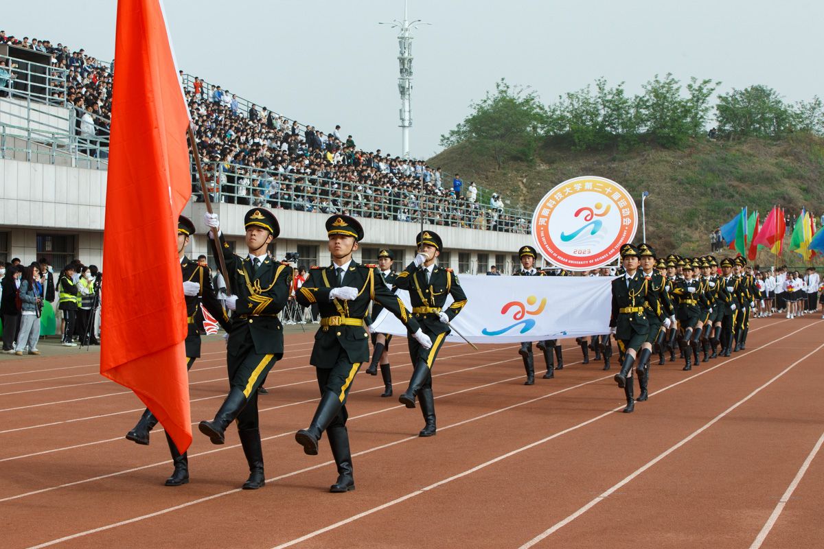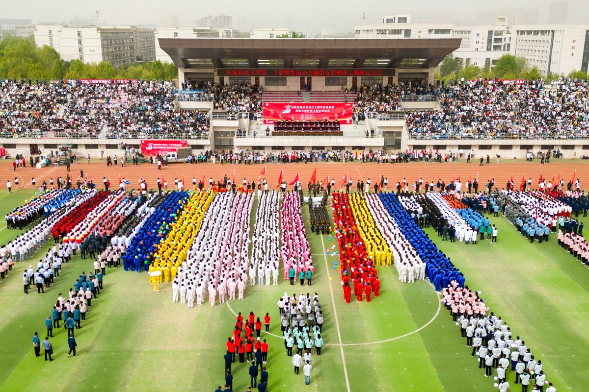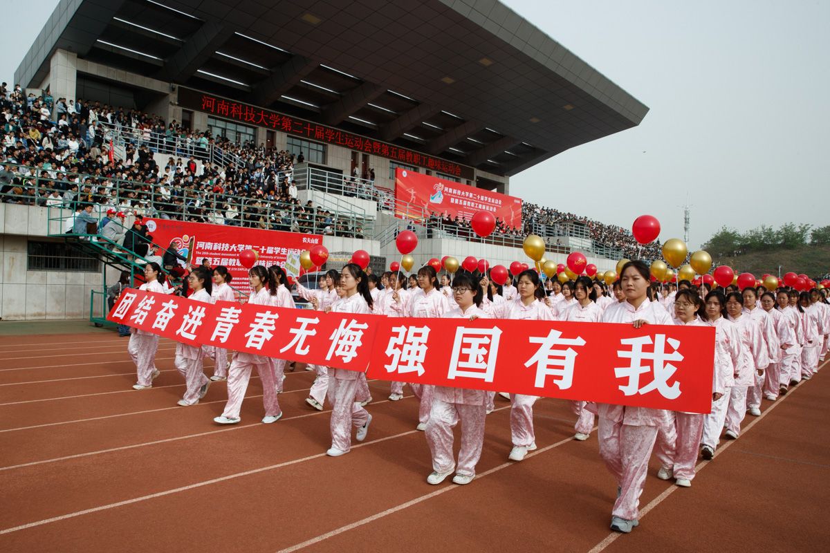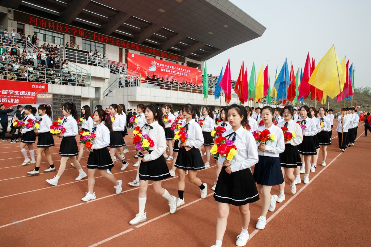 伴着雄壮有力的《运动员进行曲》,国旗护卫队、裁判员方队和各学院、直属、附属单位的运动员方队,迎着春日的朝阳,迈着矫健的步伐,喊着响亮的口号,身姿挺拔、斗志昂扬、意气风发地走过主席台。舞蹈、健美操、河洛大鼓、机器人表演、河洛风赛车巡游、留学生非洲鼓表演,各方队用不同的方式与口号展示着特色与风采。