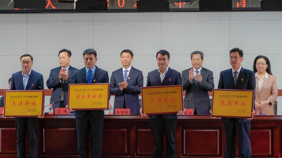 侯小改宣读《关于表彰十大网投正规信誉官网2022年度大学生创新创业先进集体和先进个人的决定》;与会领导为校团委颁发“十大网投正规信誉官网2022年度大学生创新创业突出贡献奖”,为机电工程学院、商学院、园艺与植物保护学院颁发“十大网投正规信誉官网2022年度大学生创新创业先进单位”奖牌,为机电工程学院李军星、商学院许军、园艺与植物保护学院陈双臣等指导教师代表颁发“十大网投正规信誉官网2022年度大学生创新创业优秀指导教师”证书,为机电工程学院刘洋、商学院张静、园艺与植物保护学院白雨晴等学生代表颁发“十大网投正规信誉官网2022年度大学生创新创业标兵”证书,为机电工程学院团委书记张甜甜、商学院团委书记张毅、园艺与植物保护学院团委副书记徐晓东颁发“十大网投正规信誉官网2022年度大学生创新创业先进个人”证书。