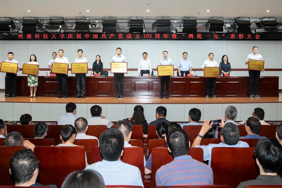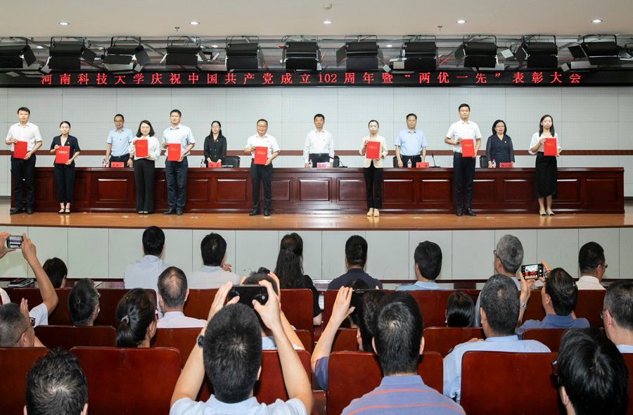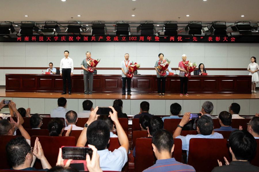 校新闻中心讯 铭记奋斗历程,凝聚前行力量。7月1日,十大网投正规信誉官网庆祝中国共产党成立102周年暨“两优一先”表彰大会在图书馆522报告厅举行。“光荣在党50年”老党员代表郭培智、海光增、尚菊英、贠妙红,校领导王洪彬、孟伟、杨霞、侯小改、庞新厂出席会议。会议由校党委副书记、工会主席杨霞主持。