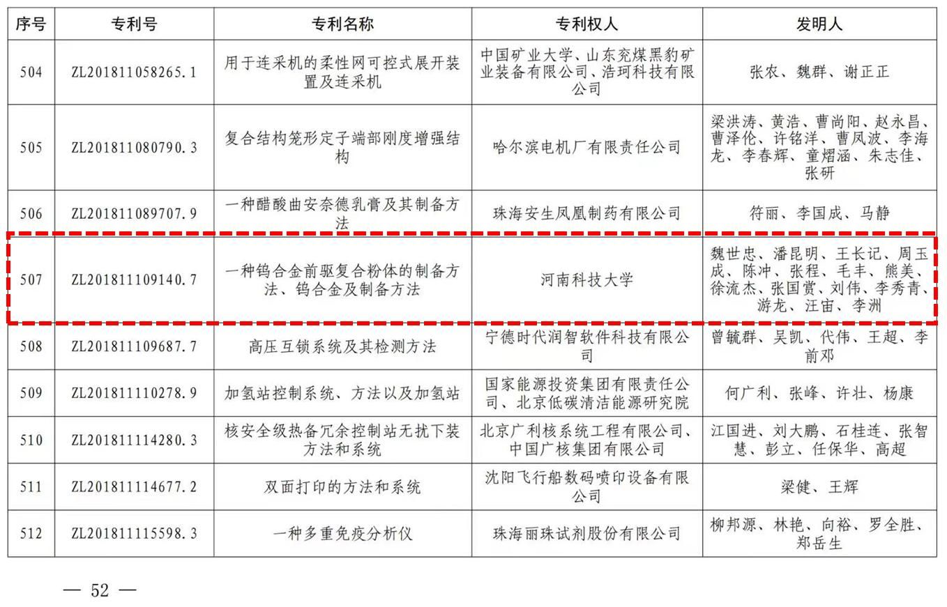 校新闻中心讯 7月19日国家知识产权局公布《国家知识产权局关于第二十四届中国专利奖授奖的决定》(国知发运字〔2023〕30号),网投官网魏世忠教授团队的专利“一种钨合金前驱复合粉体的制备方法、钨合金及制备方法(专利号:ZL201811109140.7)”荣获第二十四届中国专利奖优秀奖,这是学校知识产权工作布局、保护、运用、管理等方面持续发力,全力推进一流学科及高质量专利建设的成果。