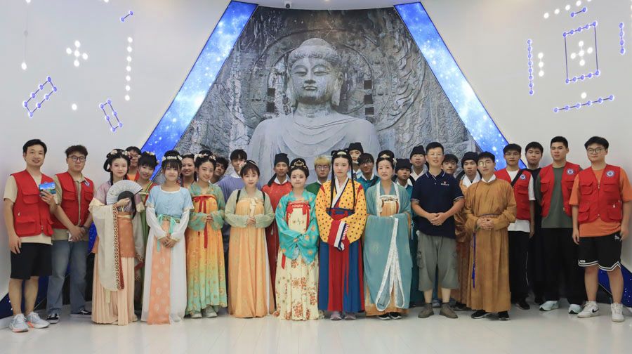 随后,汉服文化体验馆的妆造老师为夏令营成员换上了特色汉服,进行了一场沉浸式汉服体验。两校师生一同游览校园,参观龙门实验室展厅、生命科学馆,共同前往洛邑古城体验国风文化。