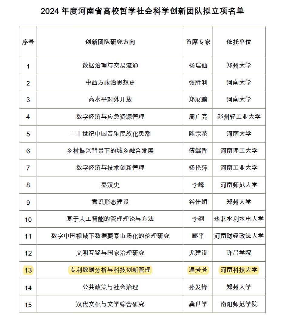 校新闻中心讯 近日,河南省教育厅公布了2024年度河南省高等学校哲学社会科学创新团队支持计划名单,全省高校共有15支团队入选,网投官网商学院温芳芳教授作为首席专家的“专利数据分析与科技创新管理”团队通过初评、答辩、会评环节后,获准立项。