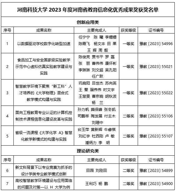校新闻中心讯 日前,河南省教育厅下发《关于公布2023年度河南省教育信息化优秀成果获得名单的通知》,公布了2023年河南省教育信息化优秀成果奖获奖名单。网投官网共获奖7项成果奖获,其中创新应用类一等奖3项、二等奖2项,理论研究类二等奖2项。