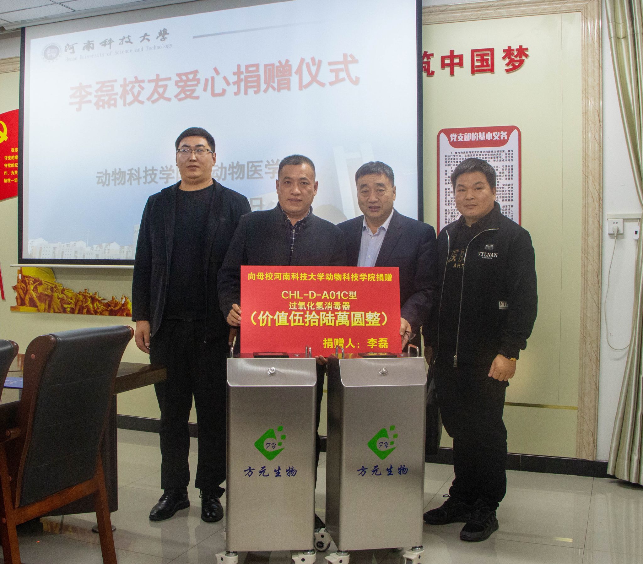 校新闻中心讯 11月7日,网投官网2001级优秀校友李磊向母校捐赠干雾过氧化氢消毒器仪式在农科2号楼331会议室举行。浙江方元净微科技有限公司总经理李磊,上海方元净微生物工程有限公司总经理苏东念、销售总监韦世永,校党政办公室、校友总会办公室、教务处、财务与资产管理部、动物科技学院(动物医学院)主要负责同志及师生代表参加仪式。