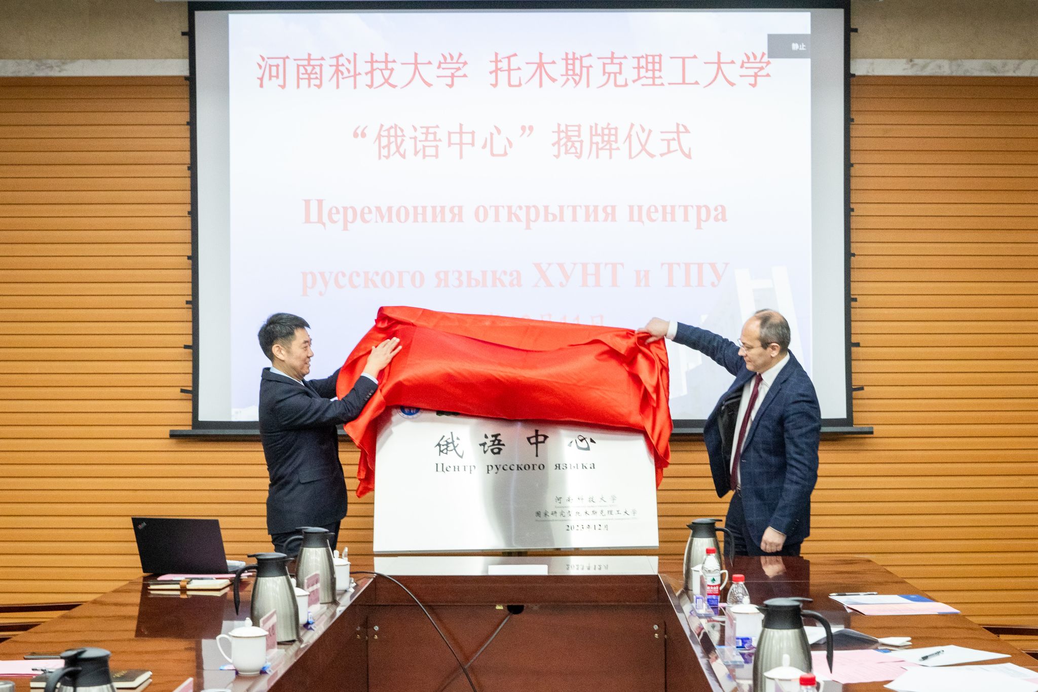 随后,王洪彬和索洛维耶夫·米哈伊尔·亚历山德罗维奇为两校共建的“俄语中心”揭牌。