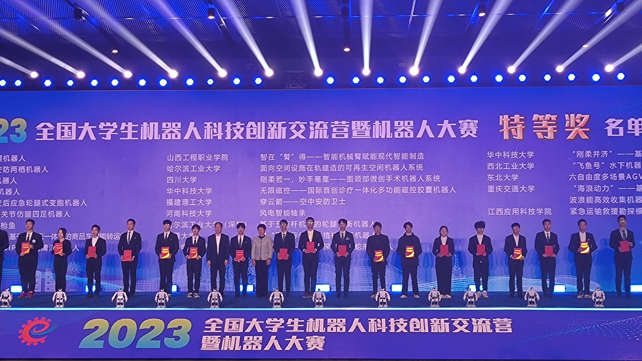 本届大赛共有工业机器人、个人及家用服务机器人、公共服务机器人、特种机器人和其他应用领域机器人等5大赛道,吸引了来自全国30个省、自治区、直辖市及新疆生产建设兵团431所高校的1017件作品参赛。经资格审查、网络初审、终审决赛的激烈角逐,大赛共决出50个特等奖、74个一等奖、94个二等奖、300个三等奖。
