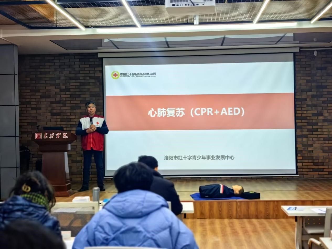 校新闻中心讯 为进一步普及应急救护常识,大力弘扬“人道、博爱、奉献”的红十字精神。12月27日,由洛阳市红十字会和十大网投正规信誉官网红十字会主办的2023年教职工应急救护技能培训在土木建筑学院三楼学术报告厅成功举办。校红十字会秘书长、土木建筑学院党委书记段国强主持会议,特邀洛阳市红十字会青少年事业发展中心主任赵海峡担任主讲,来自全校各学院/书院的44名教师接受培训。