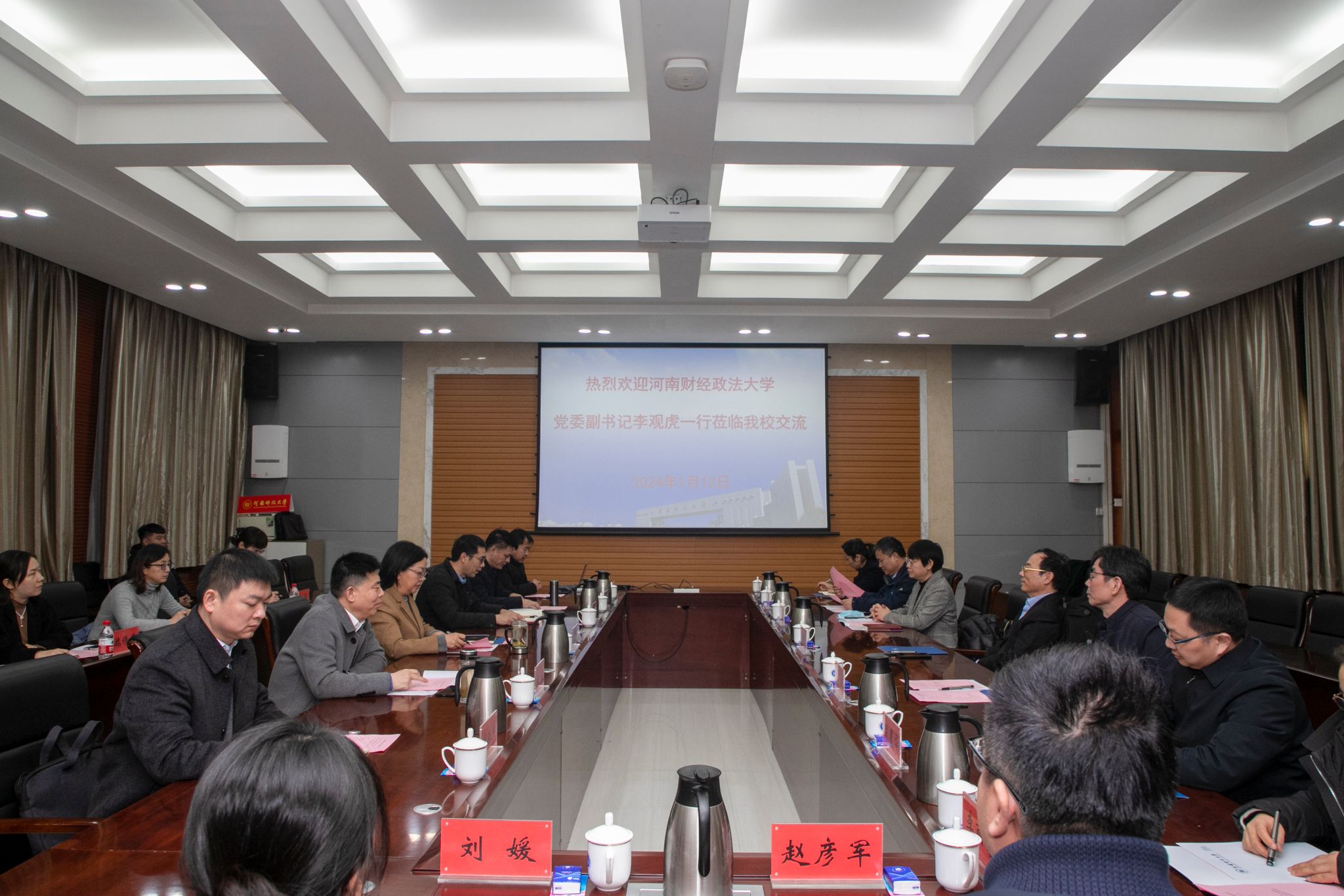校新闻中心讯 1月12日,河南财经政法大学党委副书记、工会主席李观虎一行来校调研交流。学校在博园第一会议室召开座谈会。副校长侯小改出席会议。会议由教务处处长徐红玉主持。