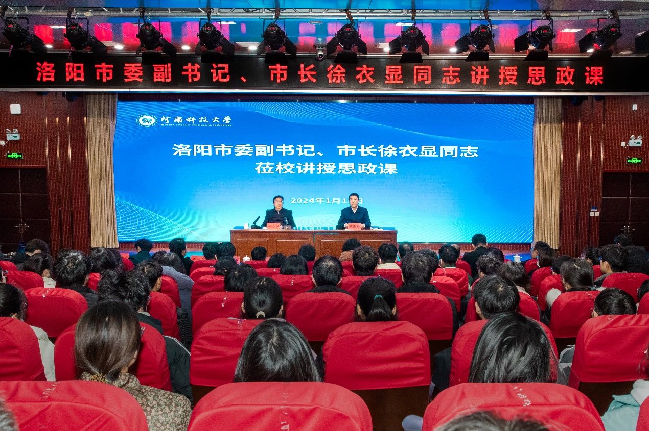 校新闻中心讯 1月15日,洛阳市委副书记、市长徐衣显到校讲授专题思政课。党委书记、校长王洪彬主持思政课。