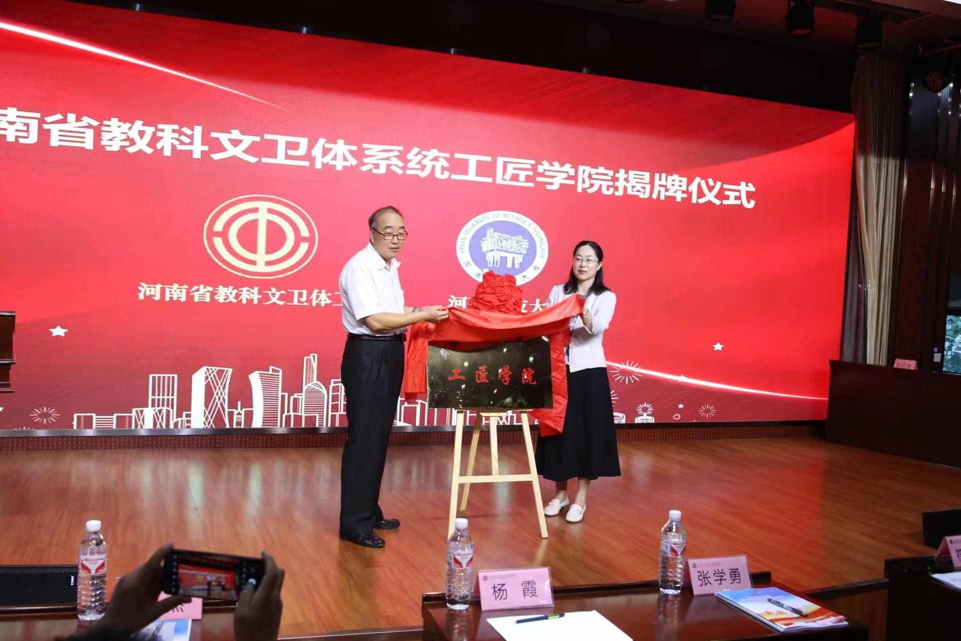 穆云超代表学校与河南省教科文卫体工会张学勇共同签署战略合作框架协议。杨霞、符明轩为河南省教科文卫体系统工匠学院揭牌。与会领导共同为工匠学院教师代表颁发聘书。