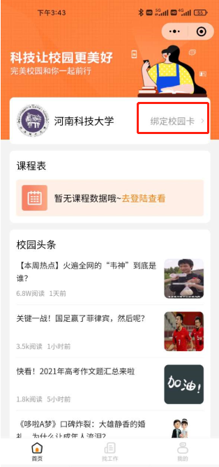 3.选择“绑定校园卡”,按提示与自己微信号绑定,显示姓名和余额时即为绑卡成功。如果不显示,请点击右下角我的--校园卡,输入校园卡对应的姓名、校园卡号和校园卡密码(默认为身份证后六位,如果有X,默认为0)进行绑定,显示姓名和余额时即为绑卡成功。