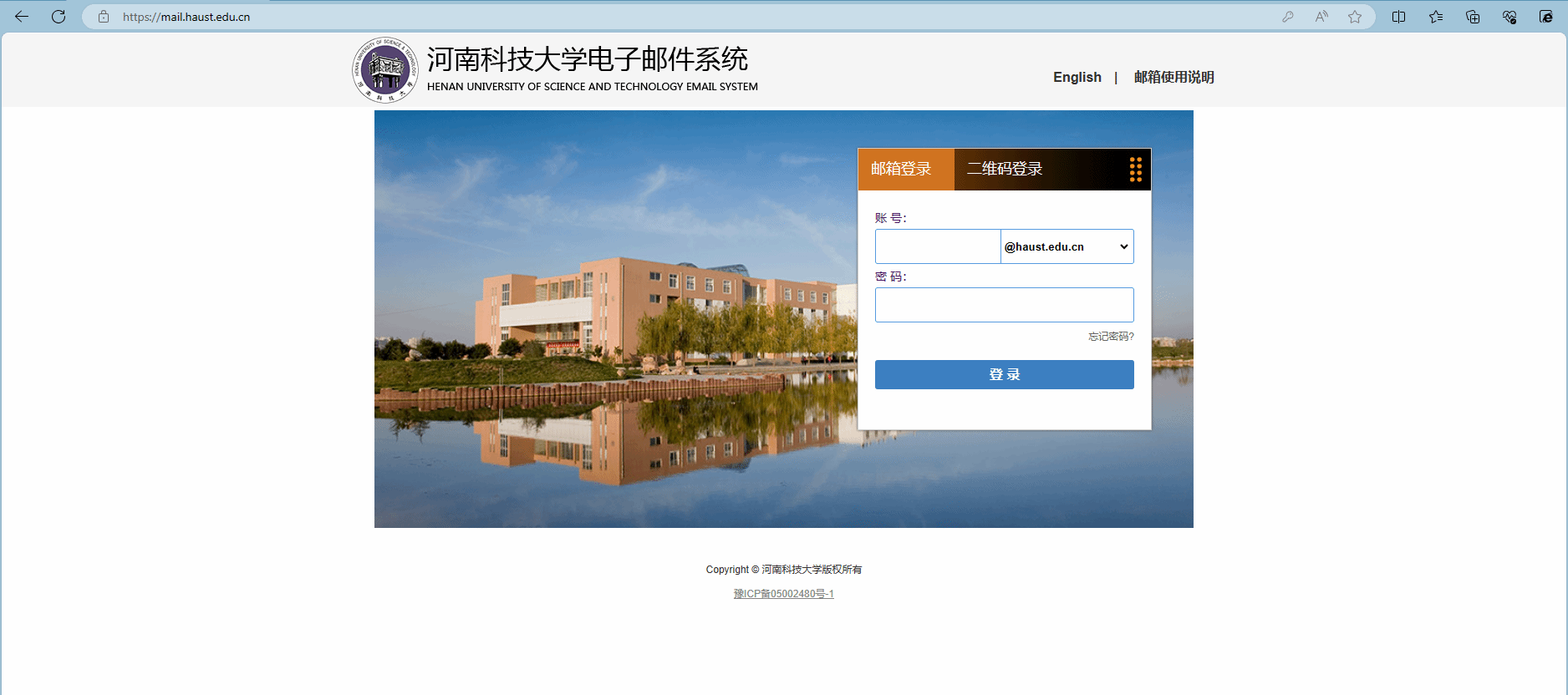 为了方便广大师生登录并使用学校的电子邮箱,网络与信息化办公室即日起对学校电子邮箱登录页面(https://mail.haust.edu.cn)做出调整。调整后,电子邮箱登陆页面如下图所示,用户首次登录和更改密码后登录邮箱不再需要 “去验证”步骤。邮箱登陆方式和申请方式暂时不变。